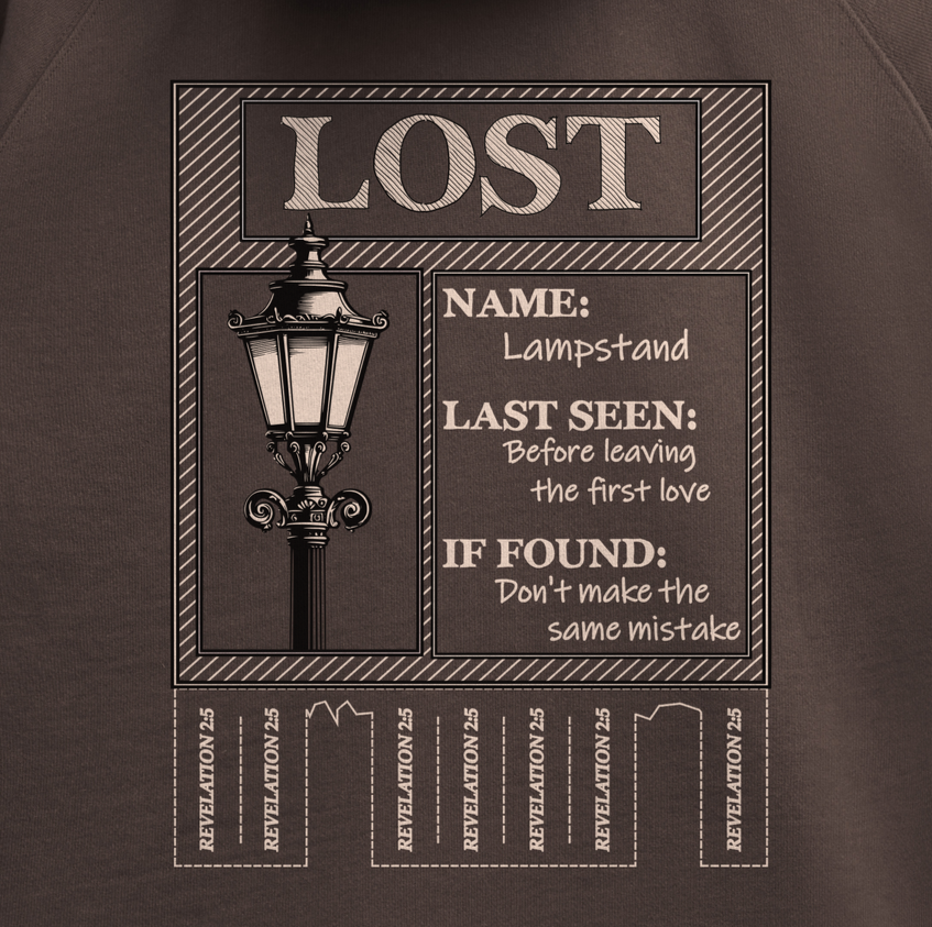 View fullsize February ‘25 Release View fullsize View fullsize View fullsize Lampstand Hoodie (Heavyweight) Size: Select Size Small Medium Large XLarge XXLarge Add to cart $80.00 Revelation 2:5 ‘Therefore remember from where you have fallen, and repent and do the deeds you did at first; or else I am coming to you and will remove your lampstand out of its place— unless you repent.